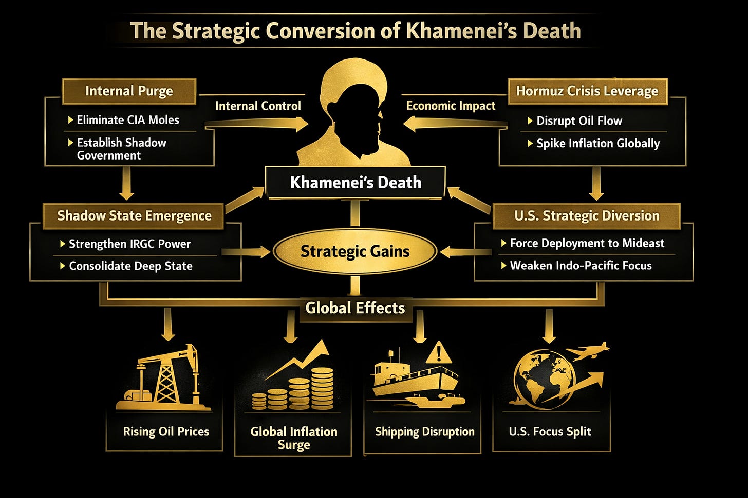 How Khamenei’s killing may have been converted into internal purification, Hormuz leverage, global inflation, and a strategic tax on American power