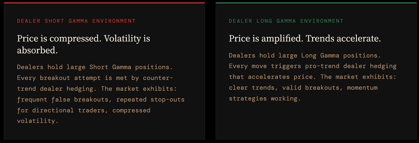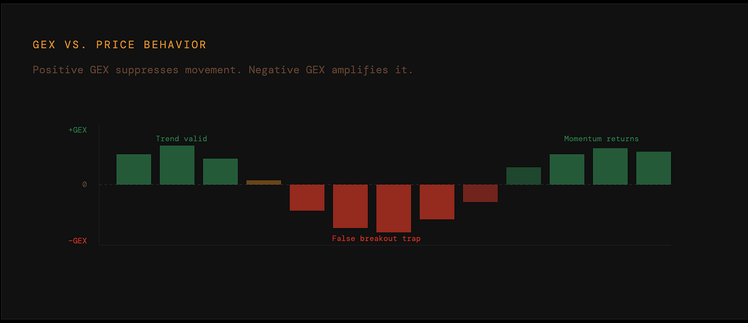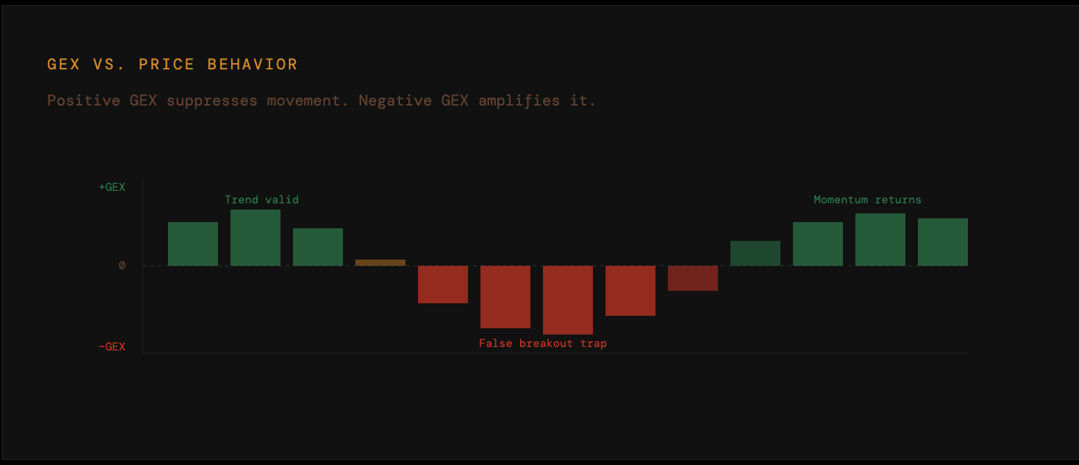 When GEX is positive, dealers are Long Gamma. Their hedging is counter-trend. Markets mean-revert. Volatility is compressed.