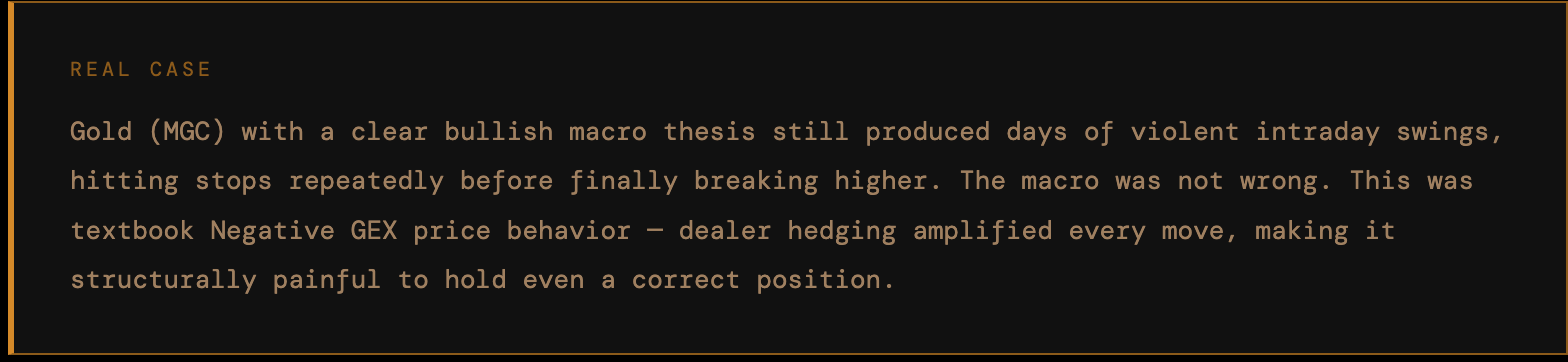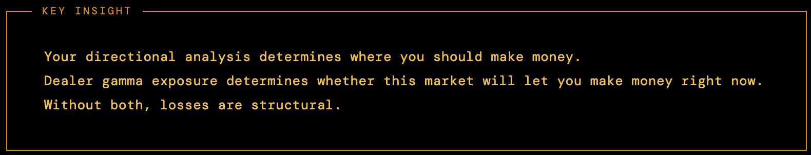 When GEX is negative, dealers are Short Gamma. Their hedging is pro-trend — but this amplification is bidirectional. It doesn’t reward you for being right. It just makes everything bigger, faster, and harder to hold.