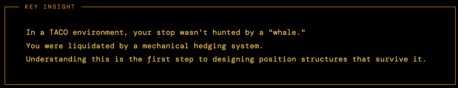 Once you understand GEX, you can understand TACO (Timed Acceleration of Contra Orders) — the mechanism by which dealer behavior in Negative GEX environments systematically manufactures false breakouts.
